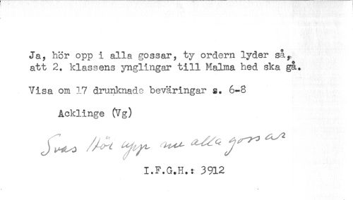 //// Ja, hör opp i alla gossar, ty ordern lyder såy //// att 2. klassens ynglingar till Malma hed ska ga. //// Visa om 17 drunknade beväringar g. 6-8 //// Acklinge (Vg) //// I.F.G.H.: 3912 ////