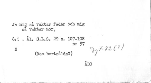 //// f //// Ja mig så vaktar fader och mig //// så vaktar mor, //// 6:5 . Ål. S.L.S. 29 s. 107-108 //// nr 57 ^ < //// N „ //// (Den bortsålda?) //// ÅBO //// ! //// ___ _____. _______ , _ . _ . , ^ ////