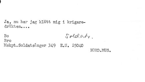//// Ja, nu har jag klätt mig i krigare- //// dräkten. ... //// Bo . //// Bro //// Mskpt.Soldatsånger 349 E.U. 25040 //// NORD. ms. ////
