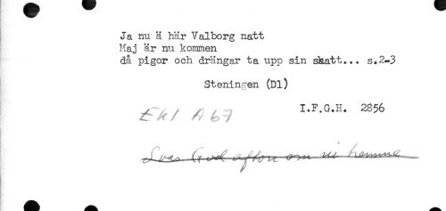 //// Ja nu ä här Valborg natt //// Maj är nu kommen //// då pigor och drängar ta upp sin skatt... s.2-3 //// Steningen (Dl) //// I. F. G. II. 28$6 //// ^ / A * ^ y //// HK ////