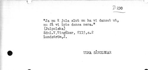 //// - - //// "Ja nu ä jula slut nu ha vi dansat ut, //// nu få vi inte dansa mera." //// (Julpolska) //// Sdml.V.Vingåker, 8115,s.2 //// Lundstrom,J. //// ^ ULMA SÅNGLEKAR ////