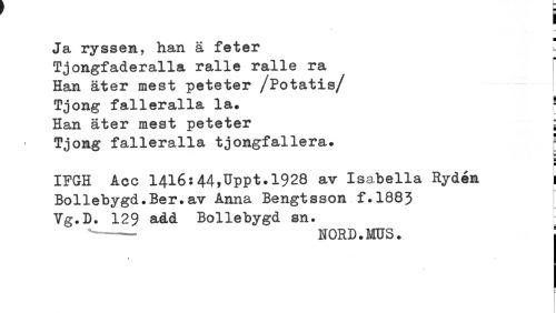 //// ! //// Ja ryssen, han ä feter //// Tjongfaderalla ralle ralle ra //// Han äter mest peteter /Potatis/ //// Tjong falleralla la. - //// Han äter mest peteter ; //// Tjong falleralla tjongfallera. ! //// IFGH Acc 1416:44,Uppt.1928 av Isabella Rydén ! //// Bollebygd.Ber.av Anna Bengtsson f.1883 //// Vg.D. 129 aåd Bollebygd sn. //// NORD.MUS. //// * ////