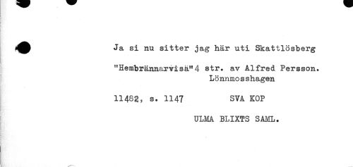 //// Ja si nu sitter jag här uti Skattlösberg //// < //// "Hembrännarvisä"4 str. av Alfred Persson. //// L ö nnmo s s hagen //// 1148g, s. 1147 SVA KOP //// ULMA BLIXTS SAIdL. //// < //// ! //// i //// ! //// < //// I ////