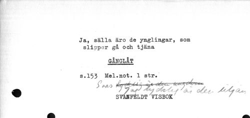 //// - - - ...... ... //// Ja, sälla äro de ynglingar, som //// slipper ga och tjäna //// GÅNGLÅT //// . * * //// s.153 Mel.not. 1 str. //// A *f ^ ^ ^ , ^^^ //// ^ SVANFELDT VISBOK ////