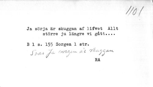 //// Ja sörja är skuggan af lifvet Allt //// större ju längre vi gått.... //// Bis. 155 Sorgen 1 str. //// j ,, ^ //// RA //// t ////