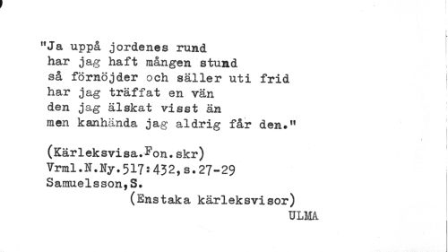//// ! //// "Ja uppå jordenes rund //// har jag haft mången stund //// så förnöjder och säller uti frid ^ //// har jag träffat en vän //// den jag älskat visst än //// men kanhända jag aldrig får den." ! //// (Kärleksvisa.Fon.skr) //// Vrml.N.Ny.517:432,s.27-29 //// Samuelsson,S. //// (Enstaka kärleksvisor) //// ULMA ////