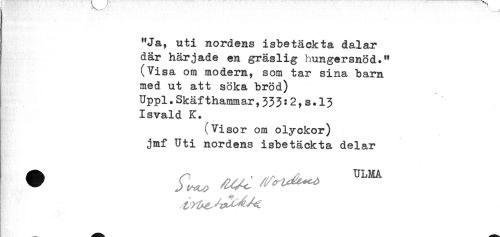 //// ' ' .' ' ! - - - ^ //// "Ja, uti nordens isbetäckta dalar //// där härjade en gräslig hungersnöd." //// (Visa om modern, som tar sina barn //// med ut att söka bröd) //// Uppl.Skäfthammar,333:2,s.l3 //// Isvald K. //// (Visor om olyckor) //// jmf Uti nordens isbetäckta delar //// g ////