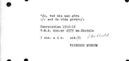//// "Ja, vad ska man göra //// :/: med de röda gevär:/: //// Exercisvisa 1910-16 //// V.M.A. Acc.nr 4379 sn.Skedala //// 7 str. a 4 v. sid.71 //// VARBERGS MUSEUM ////