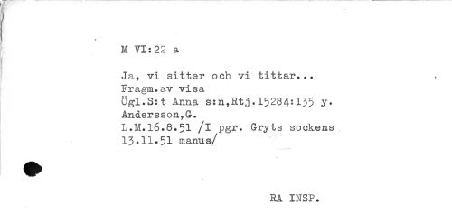 //// M VI:22 a //// ! //// Ja, vi sitter och vi tittar... //// Fragm.av visa //// Ögl.S:t Anna s:n,Rtj.15284:135 //// Andersson,G. //// L.M.16.8.51 /i Pgr* Gryts sockens //// 13.11*51 manus/ //// * //// - //// RA INSP. ////