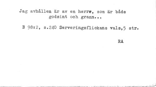 //// Jag avhållen är av en herr&, som är både //// godsint och grann... //// B 98:2, s.240 Serveringsflickans vals,5 str. //// RÅ ////