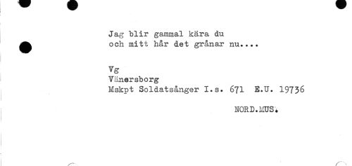 //// Jag blir gammal kära du. //// ^^ och mitt hår det grånar nu..+. //// Vg //// Vänersborg //// Mskpt Soldatsånger I.s. 6?1 E.U. 19736 //// NOR D. LiUS * ////