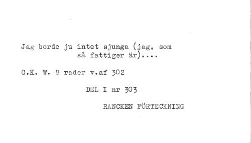 //// Jag borde ju intet sjunga (jag, som //// så fattiger är).... //// G.K. ¥. 3 rader v.af 302 //// DEL I nr 303 //// RANCKEN FÖRTECKNING ////