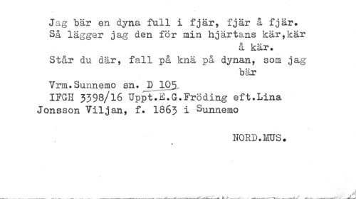 //// Jag bär en dyna full i fjär, fjär å fjär. //// Så lägger jag den för min hjärtans kär,kär //// å kär. //// Står du där, fall p& knä på dynan, som jag //// bär //// Vrm.Sunnemo sn. D IO5 //// IFGH 3398/16 Uppt.E.G.Fröding eft.Lina //// Jonsson Viljan, f. I863 i Sunnemo //// NORD.HUS. //// . _ ^ ^ -. j. .. ^ . - ////