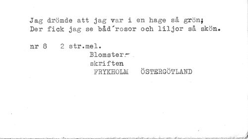 //// Jag drömde att jag var i en hage så grön; //// Der fick jag se båd'rosor och liljor så skön* //// nr 8 2 str.mel. //// Blomster.^ . //// skriften //// FRYHHOLM ÖSTERGÖTLAND ////