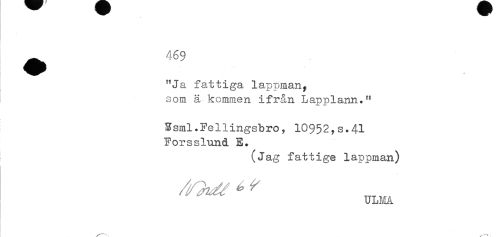 //// ^ 469 //// "Ja fattiga lappman^ //// som ä kommen ifrån Lapplann." //// Ssml.Fellingsbro, 10952,s.41 //// Forsslnnå E. //// (Jag fattige lappman) //// ULMÅ ////