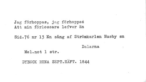 //// Jag förhoppas? jag förhoppas //// Ätt min förlossare lefver än //// Sid.76 nr 13 En sång af Strömkarlen Husby sn //// Dalarna //// Mel.not 1 str. //// DYBECK RUNA SEPT.EAFT. 1844 ////