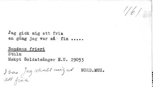 //// Jag gick mig att fria //// en gång jag var så^ fin ..... //// Bondens frieri //// Sthlm //// Nskpt Soldatsånger E.U. 29053 //// J ^^^ ^^ ^ NORD.MUS. . ////