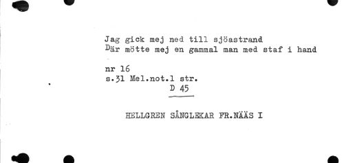 //// Jag gick mej ned till sjöastrand //// Där mötte mej en gammal man med staf i hand //// nr 16 //// s.31 Mel.not.1 str. //// D 45^ //// HELLGR3N SÅNGLEKAR FR.NÄÄS I //// - //// ! ////