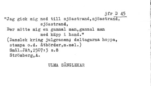 //// jfr D 45^ //// "Jag gick mig ned till sjöastrand,sjöastrand, //// sjöastrand, s //// Ber mötte mig en gammal man,gammal man } //// med käpp i hand." j //// (Danslek kring julgranen; deltagarna hoppa, //// stampa o.d* åtbörder,m.mel.) ' //// Smål.Jät,2507:3 s.8 ' //// Strömberg,A. //// ULMA SÅNGLEKAR ////