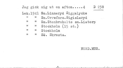 //// Jag gick mig ut en afton.....4 D 238 //// - //// Lek.1941 Sm.Linneryd Siggalycke //// " " Sm.Orrefors.Sigislaryd //// " " Sm.Stenbrohults sn.Liatorp //// " " Stockholm (15 st.) //// " " Stockholm //// " " Sö. Skresta. //// NORD.MUS. ////