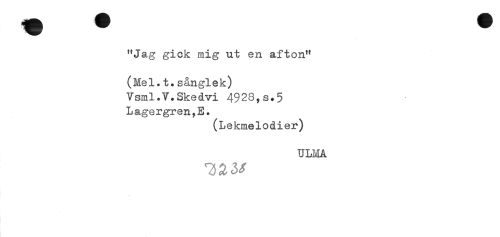 //// "Jag gick mig ut en afton" //// (Mel.t.sånglek) //// Vsml.V.Skedvi 4928,s.5 //// Lagergren,E. //// (Lekmelodier) //// ULMA ////