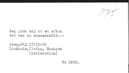 //// Jag gick mig ut en afton //// det var en sommarkväll--- //// insp,Rtj. 17125:10 //// Lindholm/Ulrika, Enskede //// (kärleksvisa) //// RA INSP. ////