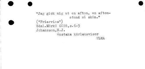 //// "Jag gick mig ut en afton, en afton- //// stund så skon." //// ^^ ("Friarvisa") //// Sdml.Mörkö 6028,s.6-9 //// Johansson,N.J. //// i Enstaka kärleksvisor //// tlLMå ////