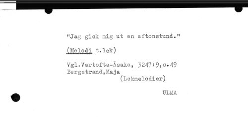 //// "Jag gick mig ut en aftonstund." //// (Melodi t.lek) //// VgltVartofta-Åsaka, 3247:9,s*49 //// Be rg s t rand,Maj a //// (Lekmelodier) //// ^ ULMA ////