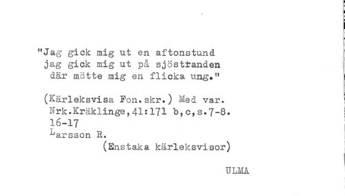 //// i //// i //// "Jag gick mig ut en aftonstund //// jag gick mig ut på sjöstranden //// där mötte mig en flicka ung." //// (Kärleksvisa Fon.skr.) Med var. //// Nrk.Kräklinge,41:171 b,c,s.7-8. ! //// 16-17 //// ^arsson R. i //// (Enstaka kärleksvisor) //// ULMA ////