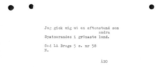 //// ^^^ ^^'' ^^^ //// Jag gick mig ut en aftonstund som //// andra //// Spatserandes i grönaste lund. //// 8:4 LA Brage 5 s. nr 58 //// N. ////