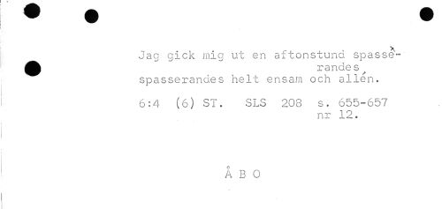 //// ^ ^ H ^ n K //// 1 //// * //// i Jag gick mig ut en aftonstund spasse- //// ' rändes //// spasserankes helt ensam och ellen. //// r;:.i (o) ST. OLS 200 s. //// nr 12. //// Å 0 O ////