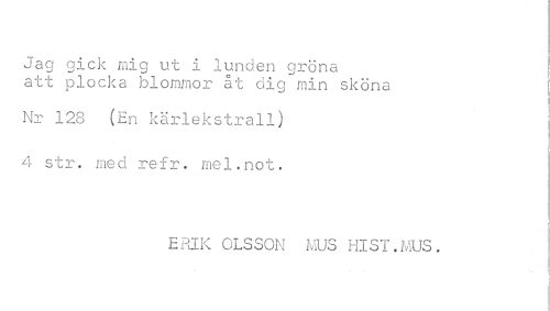 //// Jag gick mig ut i lunden gröna //// att plocka blommor åt dig min sköna I //// Nr 128 (En kärlekstrall) //// < //// t //// ! //// 4 str. med refr. mel.not. //// ERIK OLSSON MUS HlST.MUS. //// } ////
