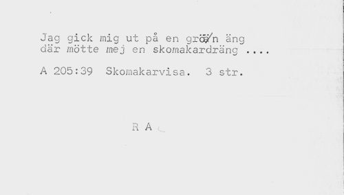 //// * //// Jag gick mig ut på en grö^n äng //// där mötte mej en skomakardräng .... //// A 205:39 Skomakarvisa. 3 str. //// R A , //// ! //// { //// . \ ////