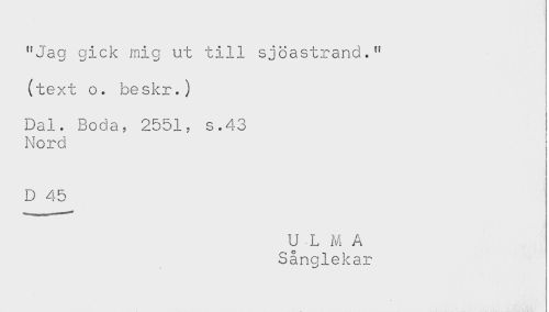 //// "Jag gick mig ut till sjöastrand." //// (text o. be skr.) //// < //// Dal. Boda, 2551, s.43 //// Nord //// ! //// D 45 ////