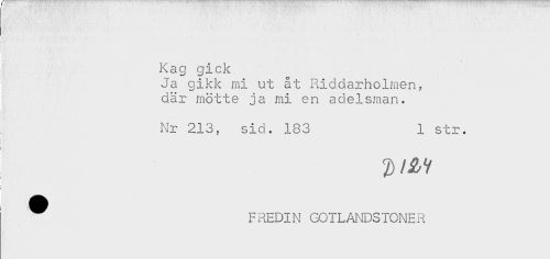 //// . ' - ' - - -. - //// i : - ."/ ' ' . ' ' . ' , ' //// - . .' . //// K an. -' - ' //// ; Kag gick //// Ja gikk mi ut åt Riddarholmen, //// där mötte ja mi en adelsman. //// Nr 213, sid. 183 1 str. //// ! //// ^ FREDIN GOILANDSIONER ////