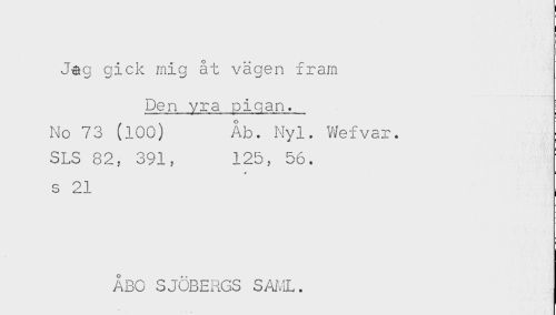 //// Jag gick mig åt vägen fram //// Den yra pigan. //// No 73 (100) Åb. Nyl. Wefvar. //// SLS 82, 391, 125, 56. //// * //// s 21 //// ÅBO SJÖBERGS SAML. ////