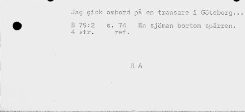 //// Jag gick ombord på en transare i Göteborg... //// B 79^2 s. 74 En sjöman bortom spärren. //// 4 str. ref. //// f //// a A //// r //// ! ^ ////