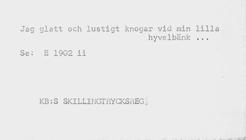 //// Jag glatt och lustigt knogar vid min lilla //// hyvelbänk ... //// Se: E 1902 ii //// KB:S SKILLINGTRYCKSREG§ ////