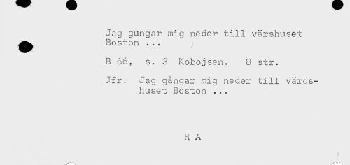 //// Jag gungar mig neder till värshuset //// ^^ Boston ... //// B 66, s. 3 Kobojsen. 8 str. //// Jfr. Jag gångar mig neder till värds- //// huset Boston ... //// R A //// ^ t ////