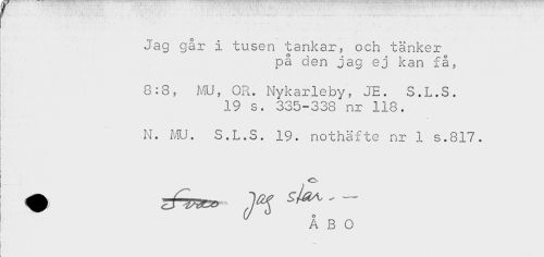 //// r - //// Jag går i tusen tankar, och tänker //// på den jag ej kan få, //// 8:8, MU, OR. Nykarleby, JE. S.L.S. //// 19 s. 335-338 nr 118. //// N. MU. S.L.S. 19. nothäfte nr 1 s.817. //// ^ ^^ ÅBO //// ! //// i ////