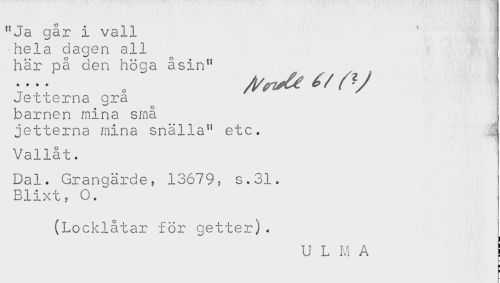 //// "Ja går i vall //// -hela dagen all //// här på den höga åsin" //// uerterna gra //// barnen mina små //// jetterna mina snälla" etc. //// Vallåt. //// Dal. Grangärde, 13679, s.31. //// Blixt, O. //// (Locklåtar för getter). //// U L M A I ////