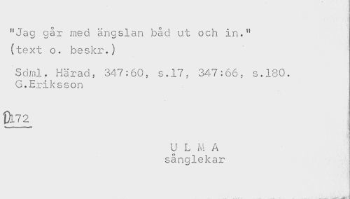 //// "Jag går med ängslan båd ut och in." //// (text o. beskr.) //// Sdml. Härad, 347:60, s.17, 347:66, s.180. //// G.Eriksson //// <i //// U L M A //// sånglekar ////