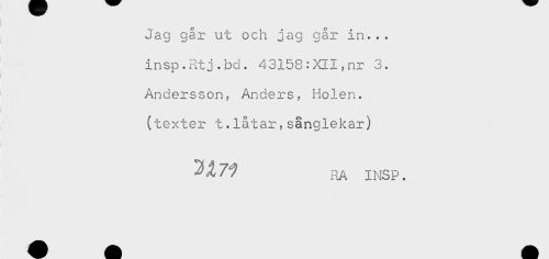 //// - //// Jag går ut och jag går in... //// insp.Rtj.bd. 43158:XII,nr 3. //// i //// Andersson, Anders, Holen. //// (texter t.låtar,sånglekar) //// RA INSP. ////