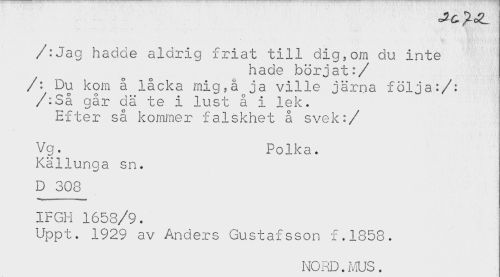 //// /:Jag hadde aldrig friat till dig,om du inte //// hade börjat:/ //// /: Du kom å lacka mig,å ja ville järna följa:/: //// /:Så går dä te i lust å i lek. //// Efter så kommer falskhet å svek:/ //// Vg. Polka. //// Källunga sn. //// D 308 //// IFGH 1658/9. //// Uppt. 1929 av Anders Gustafsson f.1858. //// NORD.MUS. ////
