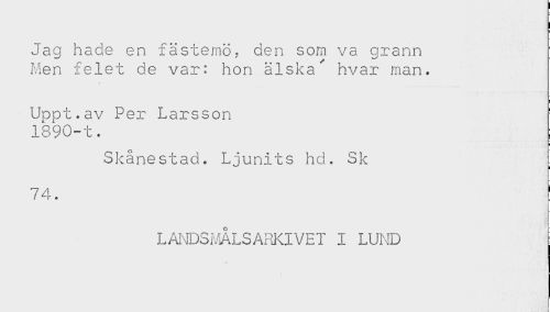 //// Jag hade en fästemö? den som va grann //// Men felet de var: hon älska" hvar man. //// Uppt.av Per Larsson //// 1890-t. //// Skånestad. Ljunits hd. Sk //// 74. //// LANDSMÅLSARKIVET I LUND ////