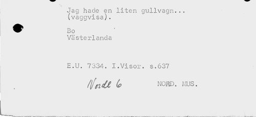 //// Jag hade en liten gullvagn... //// (vaggvisa). //// Västerlanda //// E.U. 7334. 1.Visor, s.637 //// ^^ ^ Mono. ms. ////