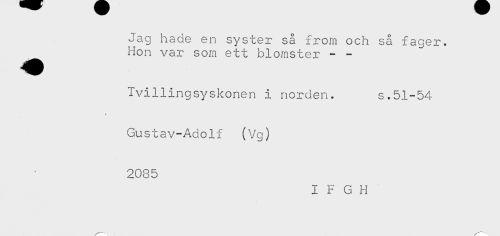//// Jag hade en syster så from och så fager. //// ^^ Hon var som ett blomster - - //// Ivillingsyskonen i norden. s.51-54 //// * //// Gustav-Adolf (Vg) //// 2085 ////