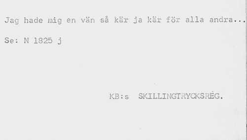 //// Jag hade mig en vän så kär ja kär för alla andra... //// Se: N 1825 j //// KB:s SKILLINGTRYCKSRÉG. ////