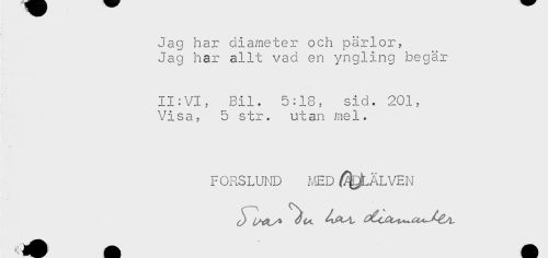 //// Jag har diameter och pärlor. //// Jag har allt vad en yngling begär //// II:VI, Bil. 5:18, sid. 201, //// Visa, 5 str. utan mel. //// r //// FORSLUND MED /^ALVEN //// J* ////