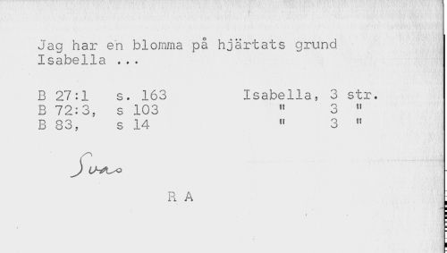 //// Jag har en blomma på hjärtats grund //// Isabella ... //// B 27:1 s. 163 Isabella, 3 str. //// B 72:3, s 103 " 3 " //// B 83, s 14 " 3 " //// R A ////